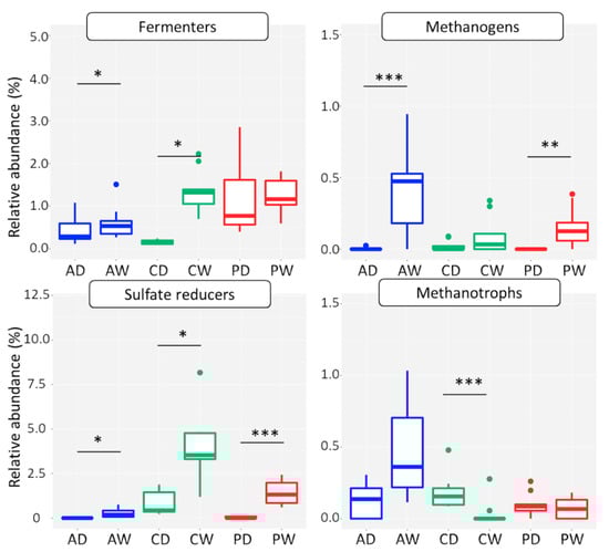 Relative abundance of functional groups in 16S rRNA gene amplicon datasets. Boxplots show relative abundance in depth and triplicate samples. X-axes represent six sites: Alderdry (AD), Alderwet (AW), Coastdry (CD), Coastwet (CW), Percodry (PD), and Percowet (PW). Functional groups were assigned from 16S rRNA gene amplicon data by FAPROTAX analysis. Asterisks indicate the significant difference between the drained and rewetted sites (Kruskal-Wallis test, * p < 0.05, ** p < 0.01, *** p < 0.001).
