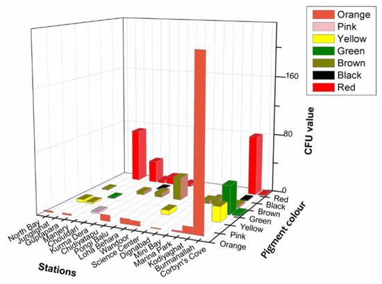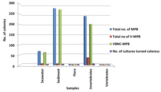 Significantly in all the examined samples, pigmented bacteria were more abundant in sediment and invertebrate samples (Figure 2). Although different pigmented isolates including yellow, orange, black, greenish, brown and red were isolated (Figure 3, Supplementary Material, Figures S1–S3), more frequently and abundantly orange, red, brown and green were observed in this study (Figure 4 and Figure 5). Among all the sampling stations, Burmanallah revealed the potential source of pigmented bacterial diversity (Figure 3). Totally, viable pigmented bacteria account for 1.4 to 14%, viable but non-culturable marine pigmented bacteria (VBNC-MPB) for 90 to 97%, pigmentation lost cultures with 0.7%–1.6% and diffusible pigment producing bacteria are 1%. Most of the pigmented bacterial isolates have grown on agar media after 10–20 days of incubation.