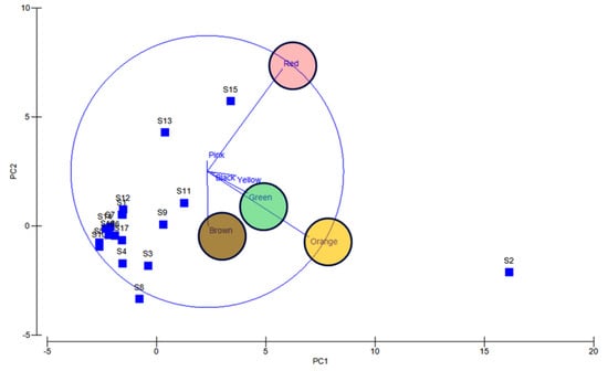 PCA analysis reveals orange, red, green and brown colored bacterial dominance. Blue lines and circles indicate the dominance and distribution patterns of pigment bacteria at different stations.