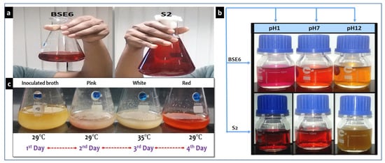 Red pigment extracts of strains BSE6 & S2.1 (a), and their pigment color variation at different pH’s (b); Heat stimulated pigmentation in strain BSE6.1 (c).