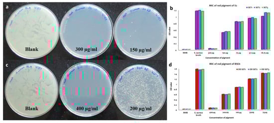 Out of fourteen pigment bacterial strains tested, two red pigment strains displayed effective antibacterial application against all the tested pathogens, including Enterococcus faecalis MTCC9845, Escherichia coli MTCC730, Klebsiella pneumoniae subsp. pneumoniae MTCC109, Salmonella enterica MTCC1165, Salmonella enterica ser. typhi MTCC733, Salmonella enterica typhimurium MTCC98, Staphylococcus aureus subsp. aureus MTCC1430 and Streptococcus mutans MTCC890. MIC and MBC analysis of both pigment extracts obtained from strain S2.1 and BSE6.1 displayed complete inhibition of S. aureus at the ranges between 150 to 400 µg/mL concentrations, respectively (Figure 8). Prodigiosin extracts (with concentrations of 50 to 400 µg/mL) obtained from various marine bacteria are reportedly displayed effective antibacterial against different pathogenic bacteria [5]. The inhibition zones (20 to 28 mm) observed in this study are greater than the previous studies [5,24]. Thus, strains S2.1 and BSE6.1 are offering great demand for drug development.
