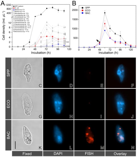 (A) Growth curves of Tetrahymena thermophila fed with water suspensions containing the selected bacterial strains (YT1–YT13), E. coli, and in the Super Proteose Peptone (SPP) medium. (B) A comparison of the growth performance of T. thermophila in three treatments: the axenic SPP, the SPP mixed with E. coli (ECO), and the SPP mixed with Bacillus sp. YT1 (BAC). The arrow indicates the timing point that cells were harvested for molecular analysis. Error bars represent the mean and standard errors. (C–N) Microphotographs of fixed cells of T. thermophila in bright field (C,G,K), after 4′,6-diamidino-2-phenylindole (DAPI) staining (D,H,L), fluoresence in situ hybridization using Cy3-labeled eubacterial probes (E,I,M), and overlay of DAPI and fluorescence in situ hybridization (FISH) (F,J,N), showing that there are no bacterial signals in the cells of the protist in the SPP treatment (C–F), few E. coli cells remained in the ECO treatment (G–J), and abundance of Bacillus sp. YT1 in the BAC treatment. (I–L). Scale bar: 20 μm.