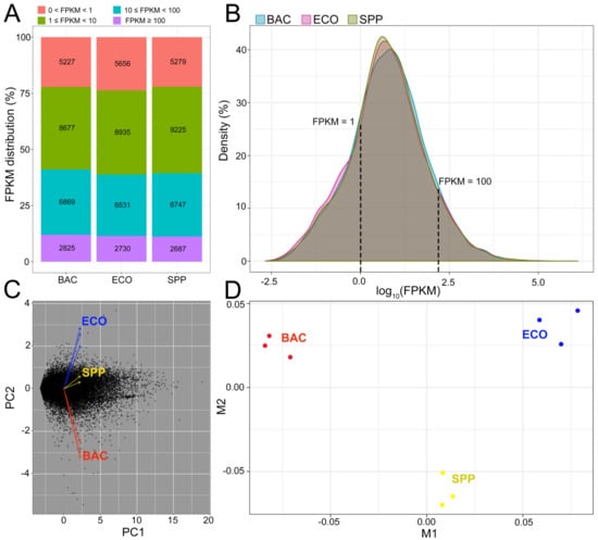 Overview of transcriptomes of T. thermophila cultured in the BAC, ECO, and SPP treatments, respectively. (A) Distribution of gene expression level in each treatment. (B) Density plot of the densities of the log10FPKM values across all genes, showing that fragments per kilobase of transcript per million fragments mapped (FPKM) ranges of the SPP (control) and two bacterial treatments were very similar, indicating no bias in the sequencing coverage among the treatments. (C) Principle component analysis and (D) multidimensional scaling based on all transcriptomic data, demonstrating the distinct gene expression pattern of the ciliate cultivated in the BAC (in red), compared to the SPP (in yellow) and the ECO treatment (in blue).