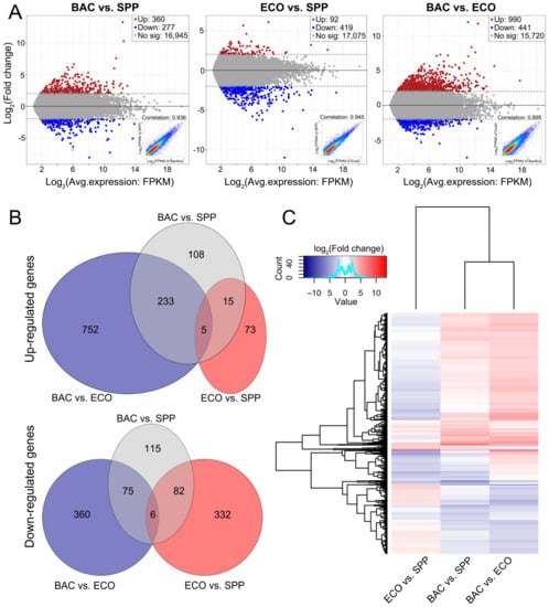 Distribution of the 1919 DEGs among the three comparisons was also profiled by hierarchical cluster analysis (Figure 3C). The comparisons of BAC vs. SPP and BAC vs. ECO displayed similar expressional profiles by sharing the main component of the upregulated and downregulated DEGs. However, opposite patterns occurred in the ECO vs. SPP treatments.