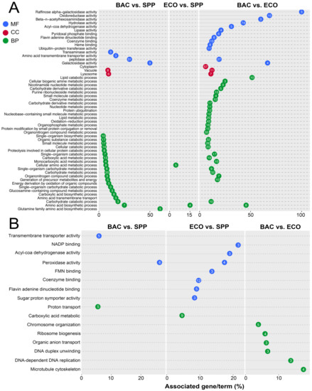 There were 224 upregulated DEGs being assigned to three major functional GO terms: biological process (BP), molecular function (MF), and cellular component (CC) (Figure 4A; Tables S3 and S4). A majority of these (222 genes) were derived from the comparison pairs of BAC vs. SPP (61 genes) and BAC vs. ECO (192 genes) (Figure 4A). Forty upregulated DEGs of the BAC–SPP comparison belonged to the MF category, of which 31 were assigned to peptidase. In the BAC vs. ECO comparison, there were 114 upregulated DEGs of the MF category, with the most abundant GO terms of hydrolase activity (GO: 0016788, 0016798 and 0004553), peptidase (GO: 0008234 and 0004197), oxidoreductase activity (GO: 0016671, 016614 and 0016616) and coenzyme binding (GO: 0050662).