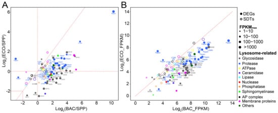 Relative expression levels of differentially expressed genes (DEGs, solid circles; |log2 (fold change)| ≥ 2) and significantly differentiated transcripts with relatively lower fold changes (SDTs, open circles; 0 < |log2 (fold change)| < 2) of T. thermophila associated with lysosomes in the pairwise comparisons between two bacterial treatment (BAC and ECO) and SPP (A), and BAC vs. ECO (B). Each dot represents an individual gene, and sizes of dots indicate expression abundance. Abbreviations: CTS, cathepsin; LGMN, legumain; Papain, papain family cysteine protease; GH, glycoside hydrolase.