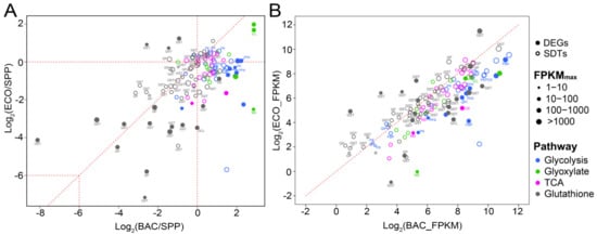 A total of 15 DEGs and 58 SDTs were involved in glycolysis, tricarboxylic acid (TCA) cycle and glyoxylate cycle (Figure 6; Table S7). The DEGs/SDTs assigned to each of these three pathways exhibited consistent transcriptional patterns (Figure 6) in the ECO–SPP and BAC–SPP comparisons. Only a single DEG annotated as encoding isocitrate lyase (ICL) was highly expressed by 3.2 folds in the ECO–SPP (Figure 6A). The expression level of this gene was even higher, about 7.3 folds in the BAC–SPP comparison (Figure 6B). ICL involved in the glyoxylate cycle catalyzes the cleavage of isocitrate to succinate and glyoxylate [44].