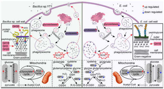 The upregulation of these GH genes in the BAC treatment could be, again, due to the chemical composition of cell wall of Bacillus. For example, the GH35 (β-galactosidases), which hydrolyzes the terminal β-galactosyl residues in carbohydrates, galactolipids, and glycoproteins [39], was among the highest upregulated in the BAC–SPP comparison (Figure 6A), implying a specific response of Tetrahymena in digesting teichoic components in Gram-positive bacteria since this phosphorylated polysaccharide is exclusively present in the cell walls of Gram-positive bacteria (Figure 7), including Bacillus [71,72,73]. Furthermore, we did not observe an accumulation of Bacillus-containing food vacuoles; it is thus highly likely that the undigested Bacillus may be egested in small vacuoles from the predator which simultaneously causes the loss of digestive enzymes, inducing higher expression and translation of GHs to compensate the digestive capability for survival (Figure 7). This potential mechanism is further supported by the enhancements of the glycolytic and TCA pathways (see below). Previous studies have showed that protists, e.g., Acanthamoeba spp. and Tetrahymena sp. were able to expel fecal pellets that contained bacterial cells into the extracellular environment [74,75].