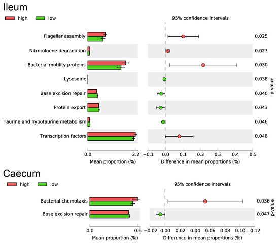 The microbial community analysis revealed differences at the genus level between high and low RFI animals only for taxa with very low abundance (Table 1). Out of the 93 genera included in the analysis of ileum, five were found to differ significantly between groups. For caecum samples, six out of 135 genera were found to be differentially abundant between experimental groups, with all six genera having a higher relative abundance in the low RFI group compared to high RFI pigs. For ileum, the differences in abundance were most prominent for Saccharopolyspora and Rothia. Functional prediction analysis showed minor differences in flagella assembly and motility protein abundance between experimental groups (Figure 1). Regarding the metabolic profile of the ileal microbial community, differences were solely observed for nitrotoluene degradation and taurine and hypotaurine metabolism. For the caecum, OTUs assigned to the unidentified rumen bacterium RFN43 genus showed the highest significant difference in relative abundance between groups (Table 1). Additionally, Leeia was found to be differentially abundant in the context of divergent RFI and represented the genus with the highest relative abundance among the differentially abundant taxa identified in both intestinal sites. Based on functional prediction analysis, the bacterial movement, represented by chemotaxis, was down regulated in the caecal digesta samples from the low RFI group (Figure 1). In both intestinal sites the microbial community analysis revealed a slight increase in functions dedicated to DNA repair mechanisms in low compared to high RFI pigs.