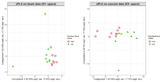 Differentiation of high (red circles) and low (green triangles) residual feed intake samples in ileum (left panel) and caecum tissues (right panel) using sparse partial least squares (sPLS). The bioinformatics approach considers the selection of 100 genes (dataset X) and 10 microbes (dataset Y) per component.