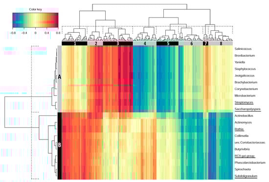 Clustered image map representing correlations between the abundance of genera in ileal digesta and differentially expressed genes of ileal mucosa in the context of divergent feed efficiency. Displayed are the top 100 genes and top 10 taxa from each of the first two components selected using a sparse partial least squares (sPLS) regression. Microbe (A and B) and gene (1–8) clusters were derived from dendrograms (dashed line) and are indicated by boxes on the top and left of the plot. Underlined taxa were differentially abundant between feed efficiency divergent pigs. The assignment of genes to the individual clusters is given in Supplementary Table S2.