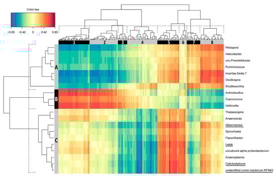 Correlations between differentially expressed mucosal genes and digesta microbe abundance of caecum in the context of divergent residual feed intake. Shown are the top 100 genes and top 10 taxa from each of the first two components selected using a sparse partial least squares (sPLS) regression. Clusters of microbes (A–C) and genes (1–8) were derived from dendrograms (dashed line) and are indicated by boxes on the top and left of the plot. Underlined taxa were differentially abundant between feed efficiency divergent pigs. The assignment of genes to the individual clusters is given in Supplementary Table S2.