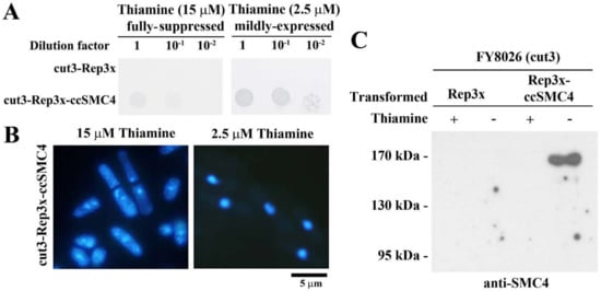 Potential CcSMC4p-mediated suppression of conditional lethality of cut3-477, a temperature-sensitive fission yeast (Schizosaccharomyces pombe) mutant in SMC4 homolog [,], was conducted for functional studies. Fission yeast strains and expression vectors were gifts from Prof. Paul Nurse (Oxford University) and Prof. Mitsuhiro Yanagida (Okinawa Institute of Science and Technology, Okinawa, Japan). The vector expressing CcSMC4 open reading frame, driven by the thiamine-repressible nmt1 promoter, was constructed in the Rep3x vector [] and transformed into fission yeast mutants under unrepressed (0 µM thiamine), fully-repressed (15 µM thiamine), or semi-repressed (2.5 µM thiamine) conditions. Fission yeast cell lysates were prepared from transformed cells incubated in supplemented Edinburgh minimal media (EMM )with or without thiamine (15 µM) for 24 h at 28 °C. All yeast manipulation and protein preparations followed established protocols [].
