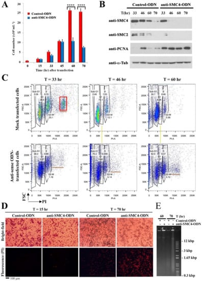Bearing in mind SMC4-knockouts commonly cause lethality, we adopted a gene-knockdown approach to study possible CcSMC4 functions. Cell proliferation in antisense-ODN-treatment (ak-cells) dropped between 24–33 h when compared to the mock-transfected cells, which continued to proliferate during the experimental period (Figure 3A). This indicated the effect of CcSMC4p-knockdown being manifested early in the experiment and that most ak-cells had been transfected with the antisense-ODNs. Gene-knockdown would not have affected the pre-existing CcSMC4p, which in other systems have both cytoplasmic and nuclear populations []. Immunoblot suggested this CcSMC4p pool dropped to undetectable levels by T = 46–70 h(Figure 3B). However, there was a sustained level of the S-phase marker PCNAp, contrasted with the periodic expression in the mock-transfected cells (Figure 3B). A flow cytogram of ak-cells exhibited sustained sub-2N populations in all later samples, contrasted with the clear gaps between G1–G2 peaks peaks (yellow line, Figure 3C). There is no global decondensation during dinoflagellate DNA replication, a consequence of no normal S-phase bridge between G1–G2, and, hence, there are clear gaps between G1 and G2/M flow peaks [,].