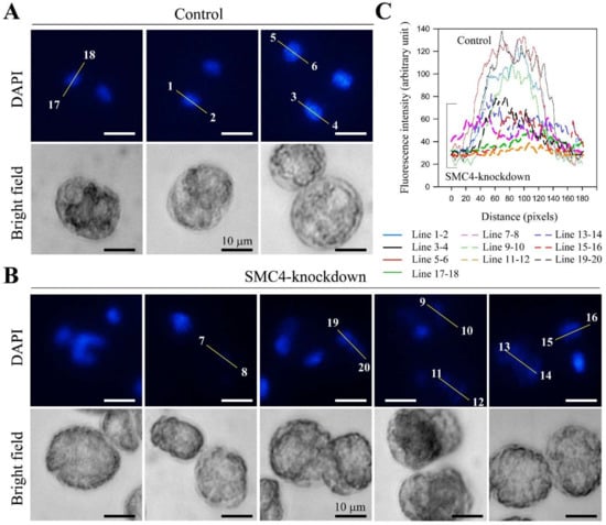 CcSMC4p-knockdown led to enlarged nuclei with reduction in DAPI staining. Fluorescent photomicrographs of (A) control cells (mock-transfected with sense-ODN); (B) ak-cells (T = 33 h) stained with DAPI; (C) quantification of fluorescent level along transects in (A) and (B). Numbers on the fluorescent photomicrographs indicate the directions and line numbers for each line transect. In CcSMC4p-knockdown cells, much lower levels and spread-out of DAPI-staining suggested enlarged nuclei when compared to control nuclei of mock-transfected cells; some ak-nuclei (e.g., 11–12, 13–14) were more enlarged than others (e.g., 15–16) when contrasted with condensed nuclei in ak-cells and totally decompacted LCCs after AMSA treatment (Figure S3B).