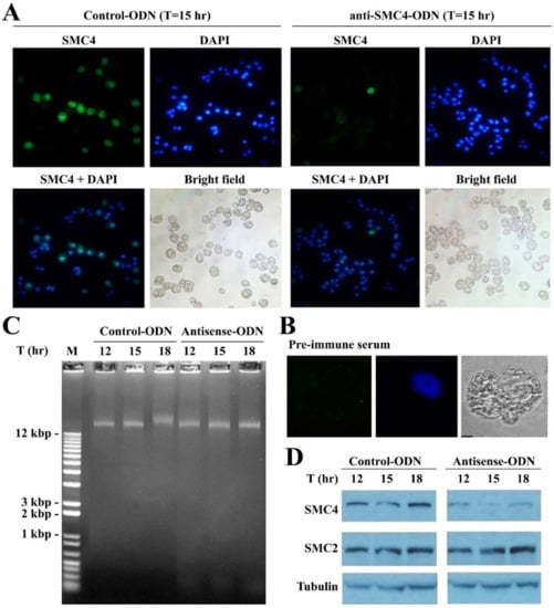 We adopted an antisense-oligonucleotide based gene-knockdown protocol [] with lipofection-spheroplasts mediated transfection in Crypthecodinium cohnii [,], according to manufacturer protocol (Lipofectamine, Invitrogen). The design of antisense oligonucleotides was aided with unpaired bases predicted on CcSMC4 mRNA (http://rtools.cbrc.jp/centroidhomfold/) []. Transfecting a combination of two anti-sense ODNs (SMC4-79, 5′-AAGGTGCGGTCAGGTGGAAACC and SMC4-129, 5′-TAGATCGGGTTGTGACGGGCATGAC) gave the best knockdown reduction of CcSMC4p (Figure S2). Control-ODNs, encoding the sense (complementary) sequence of the SMC4-79 oligo, were used as a control in the mock-transfection. Many metazoans have two condensin complexes, differing in their heat-repeat subunits and chromosome functions [], our antisense-oligonucleotide design would have targeted both complexes as the SMC proteins are shared. All experiments were carried out in triplicates, and the representative results are presented.