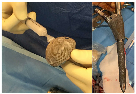 As for the group of patients in which the antibiotic hydrogel was used, the application of said hydrogel on the implant components took place immediately before their positioning. Gentamicin 200 mg was added to the hydrogel (5 mL). In cases where the surface could not be fully coated with the content of one vial, two vials (5 mL with added Gentamicin 200 mg and 5 mL with added Vancomycin 250 mg) were mixed together prior to use (Figure 1). Four ALH patients were treated with gentamicin + vancomycin and the rest with gentamicin only. All the patients underwent preoperative joint aspiration, anatomopathological analysis of the material taken intraoperatively, and microbiological analysis, including sonication of the explanted component for the exclusion of infection.
