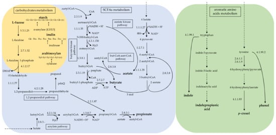 Bacterial cross-feeding has a great impact on the balance of SCFA production and affects the efficient exploitation of substrates. The cooperation between Roseburia intestinalis and acetogenic species leads to butyric metabolism without the production of H2 [43]. A. hadrus and E. hallii can use both the isomeric forms of lactate and acetate to produce butyrate, with a net consumption of 4 mol lactate and 2 mol acetate to produce 3 mol butyrate [44,45]. On the other hand, a net production of acetate has been assessed in some Coprococcus species through the acetate kinase pathway [46]. The trophic interaction between E. hallii and the infant bifidobacterial group (Bifidobacteirum longum subsp. infantis, B. breve, and a strain of B. longum subsp. suis) during the degradation of L-fucose and fucosyllactoses indicated that E. hallii acts as a metabolically versatile species able to use intermediates of bifidobacterial oligosaccharide fermentation [47].