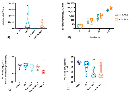 To determine the effect of the mono- and co-infections on the SP-A production we used single cell cultures of alveolar epithelial cells type II (NCI-H441 cells). To verify an efficient infection, viral titers (Figure 1A), as well as viable bacteria, were measured in a time-dependent manner (Figure 1B).