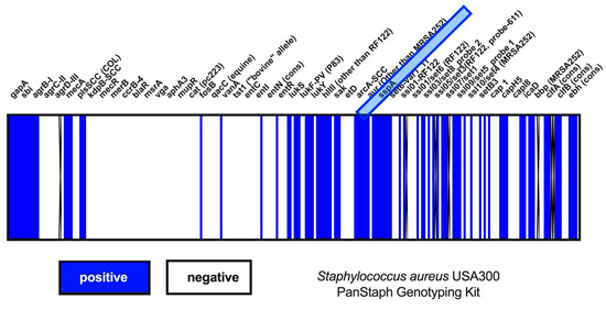After mono-infection with IAV or S. aureus and after co-infection, SP-A mRNA-expression was not changed. By contrast, treatment with TNF-α, a well-known suppressor of SP-A, resulted in significantly decreased SP-A mRNA expression (Figure 1C). Next, we evaluated the protein levels of SP-A in epithelial supernatants. Here we were able to show that SP-A is significantly decreased after 18 h of bacterial mono- or co-infection (Figure 1D). This finding can be attributed to the cysteine protease staphopain A (ScpA, ssPA) that cleaves SP-A. We have verified the presence of ssPA in the bacterial strain S. aureus USA300 by using the PanStaph Alere Genotyping Kit (Figure 2). Here, we were able to demonstrate that S. aureus USA300 disposes of a large number of virulence factors. For instance, S. aureus strain USA300 expresses leucocidins (lukS, lukF), phenol-soluble modulin (PSM) [22], and superantigens (ssl) that are mainly directed against immune cells and induce strong proinflammatory and cytotoxic effects [31].