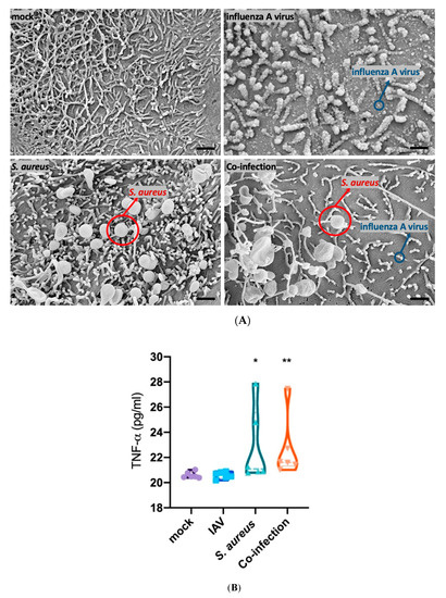 In summary, our results show that TNF-α expression after S. aureus infection was much higher in macrophages than in epithelial cells, whereas IAV-infection did not significantly increase the TNF-α expression in either cell types (Figure 3).