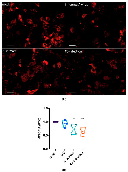 The regulation of SP-A is dependent on cytokines, in particular on TNF-α. TNF-α is capable of altering the mRNA level of SP-A via the phosphorylation of p38 mitogen-activated protein kinases [46,47]. As a consequence, an increased TNF-α level during an S. aureus infection hampers the function of SP-A. It is well known that S. aureus infections lead to a high release of TNF-α, in particular originating from immune cells, such as macrophages. Yet, TNF-α expression was not increased upon IAV infection in immune cells within the present experimental setting.