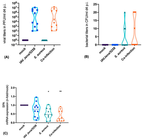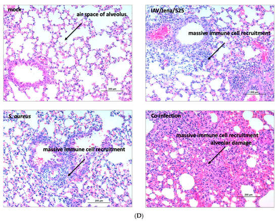 Eight-week-old female C57bl/6 mice were infected with the IV strain HA-D222-mpJena/5258, S. aureus USA300 or with both pathogens in a co-infection. Therefore, the mice were anesthetized by isoflurane inhalation and intranasally inoculated with HA-D222-mpJena/5258 (5 × 104 plaque-forming units (PFU)) in 20 μL NaCl or only 20 µl NaCl (mock-treated). The same method was used for S. aureus infection (1 × 107 CFUs) two days later. During the infection period, the state of the animal health was monitored up to two times per day by controlling the weight, temperature and the scoring of the general behavior condition. Four days after HA-D222-mpJena/5258-infection, animals were sacrificed, and samples of blood and lung were subjected to further analysis. The viral titer and the bacterial counts of infected mice were determined in the right inferior lung lobe.