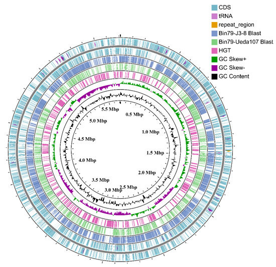 Circular representation of the Cellvibrio sp. Bin79 genome. The contents of the feature rings (starting with the outermost ring) are as follows: Ring 1 and Ring 2, features from the forward and reverse strands, respectively, CDSs are drawn as arcs, and tRNAs and repeat regions are drawn as arrows; Ring 3 (Cellvibrio mixtus subsp. mixtus J3-8) and Ring 4 (Cellvibrio japonicus Ueda107) show BLAST comparison results (BLASTN, E-value 1e−20) with the Bin79 genome, the BLAST comparison results are drawn with partial opacity, and darker regions indicate that multiple hits to the corresponding sequence region were observed; Ring 5 shows the genomic regions acquired via horizontal gene transfer; Ring 6 shows GC skew; and Ring 7 shows GC content. The plot was drawn using the CGview server [23].
