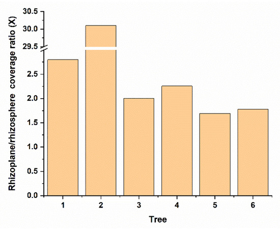 Abundance comparison between rhizosphere and rhizoplane niches of Bin79. The genome coverage ratios between the rhizosphere and rhizoplane niches are calculated by dividing the number of reads mapped from a rhizoplane sample by the number of reads mapped from the corresponding rhizosphere sample.