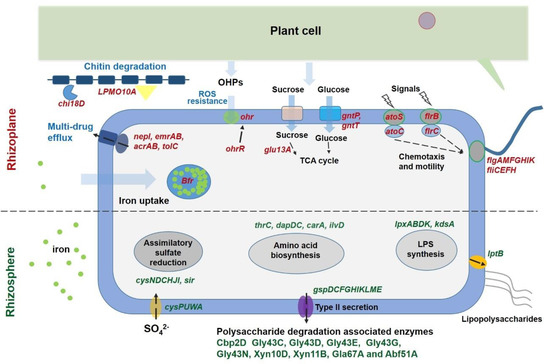 Overview of the genes with expression level differing between rhizoplane and rhizosphere habitats. Genes with higher expression level in the rhizoplane niche are red colored, while genes with higher expression level in the rhizosphere habitat are dark green colored. Iron is indicated by green circles, chitin is indicated by blue line-linked rectangles. The arrows denote influx and efflux of compounds.