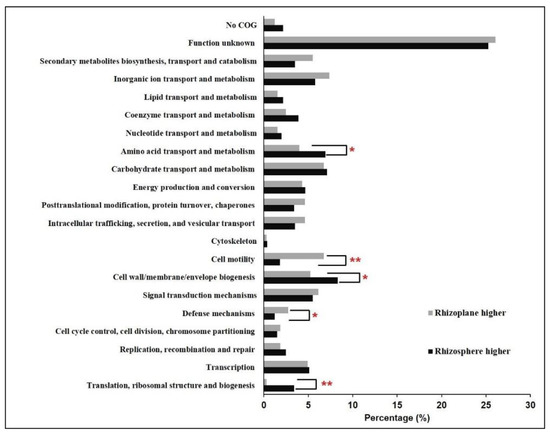 Besides the observed differential expression of genes involved in carbohydrate metabolism between the rhizoplane and rhizosphere, the sulfate transporter-encoding gene (cysPUWA) and genes involved in assimilatory sulfate reduction (cysNDCHJI and sir) exhibited higher expression levels in the rhizosphere (Figure 3). Sulfur is an essential element for biosynthesis of cellular constituents in bacteria, for instance, it is a universal substrate for cysteine biosynthesis. Furthermore, with the genes that were exhibited, significantly higher expression levels in the rhizosphere were found to be overrepresented in the COG category “Amino acid transport and metabolism” (Figure 4), and several genes involved in amino acid synthesis, such as thrC (threonine synthesis), dapD and dapC (lysine), carA (arginine), and ilvD (isoleucine, leucine, and valine), were observed to exhibit higher expression levels in the rhizosphere (Figure 3). In line with these observations, more genes belonging to the function category “Translation, ribosomal structure, and biogenesis” showed higher expression levels in the rhizosphere, and several ribosome assembly-associated genes, such as rpsK, rpsQ, rplT, and rplN, showed higher expression levels in the rhizosphere (Figure 3 and Figure 4). These results suggested that the cells in the rhizosphere had to synthesize more nutrients by themselves compared with those in the rhizoplane, and further supported the notion that the microbes colonizing the rhizoplane enjoy superior access to plant root exudates, which are rich in easy-to-use nutrients for the microbes, compared with those microbes colonizing the rhizosphere [6,8].