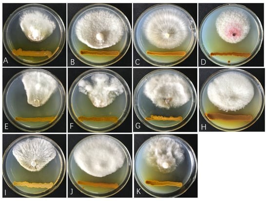 In vitro antifungal activity of ST-TJ4 against 11 phytopathogenic fungi in dual-culture assays. (A) Pestalotiopsis versicolor; (B) Cytospora chrysosperma; (C) Rhizoctonia solani; (D) Fusarium graminearum; (E) Phomopsis ricinella; (F) Botryosphaeria berengeriana; (G) Fusicoccus aesculin; (H) Colletotrichum tropicale; (I) Sphaeropsis sapinea; (J) Fusarium oxysporum and (K) Phomopsis ricinella.