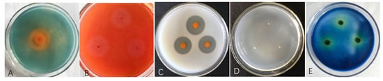 According to the previous methods [,,,], Chrome Azurol S (CAS) agar plates, carboxyl methyl cellulose (CMC) agar plates, skim milk powder (SMP) agar plates, colloidal chitin agar plates, and Pachyman solid medium were made to detect the production of siderophore, cellulase, protease, chitinase, and β–1,3 glucanase, respectively. The single colony of ST–TJ4 picked with a toothpick was used to inoculate the aforementioned media, which were incubated in the dark at 28 °C. After three days, the transparent circle around the colony was observed.