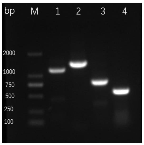 Detection of antibiotic genes in ST–TJ4 by PCR amplification (lane M, DNA marker; 1, PCA; 2, PHZ; 3, PRN; 4, PM).