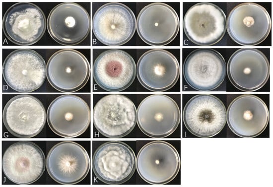 The antifungal spectrum of strain ST–TJ4 VOCs. Plate on the right treated with VOCs, plate on the left untreated. (A) Pestalotiopsis versicolor; (B) Rhizoctonia solani; (C) Fusicoccus aesculi; (D) Cytospora chrysosperma; (E) Fusarium graminearum; (F) Colletotrichum tropicale; (G) Phomopsis ricinella; (H) Botryosphaeria berengeriana; (I) Sphaeropsis sapinea; (J) Fusarium oxysporum and (K) Phytophthora cinnamomi.