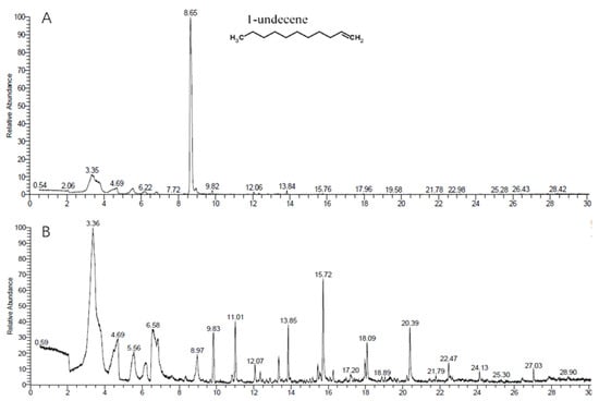 Chromatographic profiles of the volatile organic compounds (VOCs) of (A) strain ST–TJ4 incubated for 48 h in LB medium and (B) uninoculated LB medium.