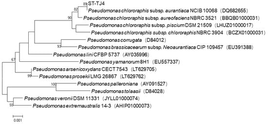 Phylogenetic tree derived from the 16S rRNA-encoding gene sequences of strain ST–TJ4 and related taxa of Pseudomonas. The tree was constructed using the neighbor-joining method using MEGA 7.0. The bootstrap test was conducted with 1000 replicates. Bootstrap values >50% were indicated at the nodes. The scale bar represents substitutions per nucleotide position.