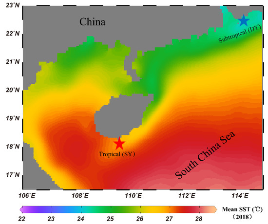 Sampling maps: Red star (★) represents the tropical reef (SY), Hainan Island, in the northern part of the SCS; Blue star (★) represents the subtropical reef (DY), which is located southeast of Shenzhen City of Guangdong Province, China. The mean annual SST heatmap was generated using data from the NOAA (https://coralreefwatch.noaa.gov/product/5km/index_5km_composite.php) for 2018.