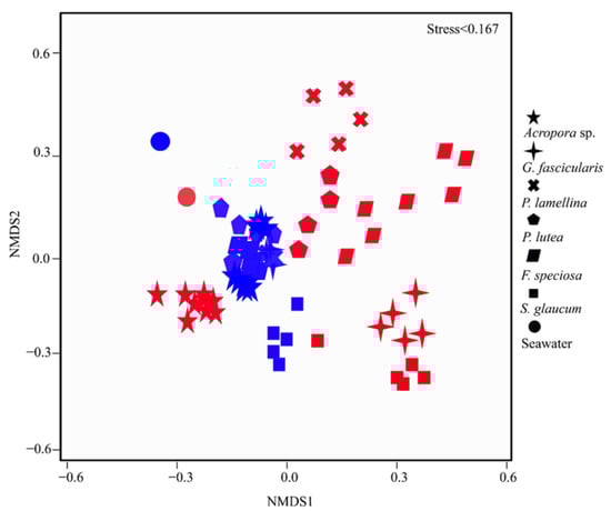Non-metric multidimensional scaling (NMDS) ordination of coral microbiome assemblages based on Bray–Curtis distance. Different symbols represent different coral species (the names of different coral species and corresponding symbols were illustrated on the right of the NMDS ordination plot). The solid cycle represents seawater. Red symbols indicate samples from the SY reef, and blue symbols represent samples from the DY reef.