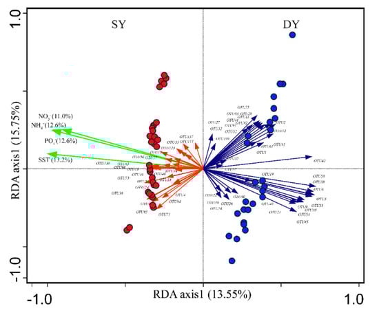 RDA (Redundancy analysis) depicting the relationships of coral microbiomes (top 60 OTUs) with hosts and environmental parameters. The arrows represent coral microbiome enriched in the tropical SY (red) and the subtropical DY (blue) reefs, respectively. The green arrows represent environmental factors. The solid cycles represent coral samples from the tropical SY (red) and the subtropical DY (blue) reefs, respectively.