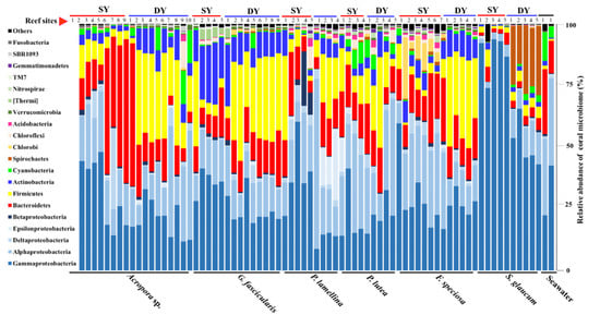 Bar plot of the relative abundance of coral microbiome at the phylum level. Each bar represents the relative abundance of different bacterial phylum in coral microbiomes or seawater samples.