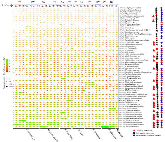 Profiles of the top 60 abundant OTUs affiliated to different bacterial phylotypes detected in explored coral samples. Relative abundance was log10 transformed for plotting. The bottom panel represents coral species. The top panel represents reef sites of each coral species from the tropical SY and subtropical DY reefs. The red triangle of the right panel represents coral core microbiome. The stars represent the host-specific microbiome, and the solid cycles represent environmental related microbiome (red cycles represent coral associated bacteria enriched in the tropical SY reef; blue cycles represent coral associated bacteria enriched in the subtropical DY reef).