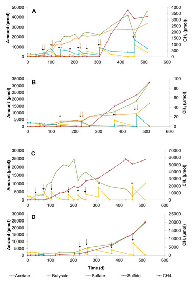 Significant differences in terms of product formation and consumption in high (20 mM) and low (3 mM) sulfate-amended SMTZ slurries at 25 °C suggest that the sulfate concentration is an important environmental factor in butyrate conversion (Figure 2A,C). Reduced and delayed methane formation in high sulfate-amended slurries possibly indicated sulfide inhibition on methanogenesis [38]. Rapid methane formation after day 523 in high-sulfate-containing slurries might be related to the adaptation capacity of hydrogenotrophic methanogens to the slurry conditions, involvement in syntrophic butyrate conversion, and simultaneous increase of acetate (Figure 2A). This suggests that methanogenesis could still occur despite the ongoing sulfate reduction and the high sulfide level. On the other hand, high methane production with concomitant acetate consumption in low sulfate-amended SMTZ slurries indicated an efficient syntrophic butyrate conversion involving acetate- and hydrogen-dependent sulfate reduction and methanogenesis processes along the incubation (Figure 2C). Apparently, low amounts of sulfate stimulated the whole microbiome, resulting in a fast and dedicated population performing both sulfate reduction and methanogenesis.