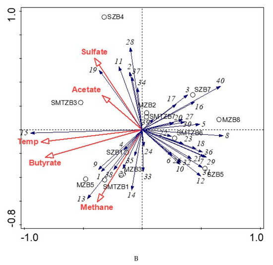 Redundancy analysis was performed as implemented in the CANOCO 5 software package (Biometris, Wageningen, The Netherlands) in order to assess to what extent experimental variables influenced the microbial community composition. The experimental variables tested were the incubation temperature, total concentrations of sulfate, butyrate, acetate, and methane consumed/produced by the end of the incubations. A Monte Carlo permutation test based on 499 random permutations was used to determine which of the experimental variables significantly contributed to the observed variance in the composition of microbial communities at the order (for bacteria) and family level (for archaea). Orders and families of at least 5% relative abundance in any sample were included in the analysis. The community structure was visualized via ordination triplots with scaling focused on intersample differences. Correlations between bacterial and archaeal groups and experimental parameters were determined by means of the two-tailed Spearman’s rank-order correlation test using the statistical software SPSS Statistics (IBM SPSS Statistics, Version 22, IBM Corp., Armonk, NY, USA). A statistical significance level of 5% was applied. Multivariate canonical correspondence analysis (CCA) [36] was performed using R statistical analysis software to find phylogenetic groups and IPLs that correlate with each other or with particular incubation conditions.