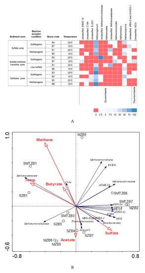 The number of reads per incubated slurry for archaeal sequences varied from 9120 to 136,909 (Table S3). In all libraries from slurry samples, the highest average percentage of 16S rRNA reads for Archaea clustered within the families Methanomicrobiaceae (60.8%), Methanosarcinaceae (16.3%), and Methanosaetaeceae (9.3%) (Figure S4). The fractional abundance of the two aceticlastic methanogenic families Methanosaetaceae and Methanosarcinaceae did not correlate to each other or other taxonomic groups and environmental parameters (Figure 5A and Figure S5). Both families did not correlate with the hydrogenotrophic methanogenic family Methanomicrobiaceae, among which Methanosarcinaceae showed significant negative correlation (p < 0.05). The relative abundance of Methanosaetaceae increased with increasing temperature, but was negatively affected by the presence of sulfate. Methanosarcinaceae did not show any significant positive correlation to any of the environmental parameters (Figure 5A and Figure S5). Unclassified Methanomicrobiales and EJ-E01 were positively correlated to methane, whereas Methanomicrobiaceae was positively correlated only to acetate (Figure S5). This result is consistent with the fact that Methanomicrobiaceae had high relative abundance in the slurries in which acetate accumulated to very high concentrations (Figure 5B). Methanogenium belonging to the family Methanomicrobiaceae was the most dominant genus among the slurries, followed by the genus Methanosarcina from the family Methanosarcinaceae (Figure 5A). Methanosaetaeceae was dominant only in two slurry samples incubated at 25 °C with low and without sulfate, with 43% and 67% of the reads, respectively. These reads belonged to Methanosaeta and unclassified Methanosaetaceae (Figure 5A).