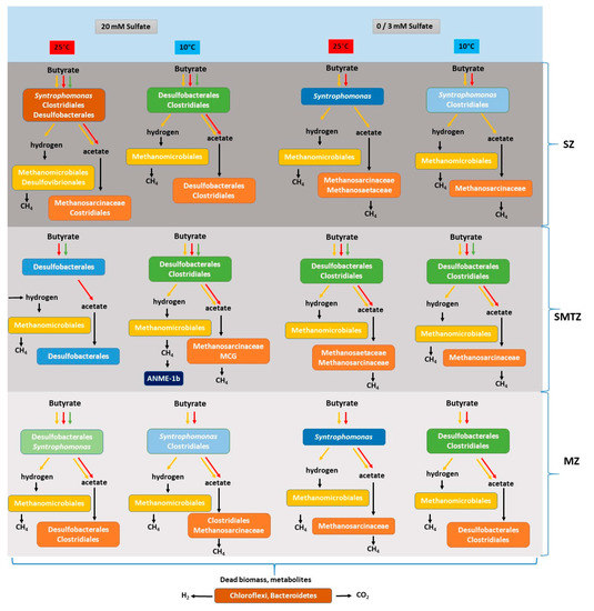 Overview of butyrate conversion and the proposed responsible microbial community at different temperatures and sulfate concentrations in enrichment slurries of sulfate, sulfate–methane transition, and methane zone sediment of Aarhus Bay. Possible butyrate conversion pathways are shown with different colored arrows; red arrows represent incomplete butyrate conversion coupled to sulfate reduction, green arrows represent complete butyrate conversion coupled to sulfate reduction, yellow arrows represent syntrophic butyrate conversion. Horizontal arrow represents the substrates originated from fermentation, decomposition of dead biomass, and/or metabolites.
