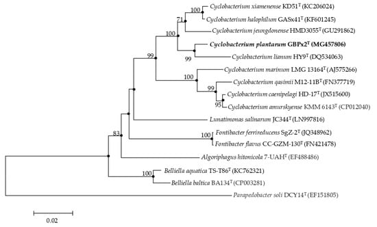 Maximum-likelihood phylogenetic tree based on the 16S rRNA gene sequence comparison, showing the relationships between strain GBPx2T and members of the family Cyclobacteriaceae. Filled circles indicate nodes that were also obtained in trees based on minimum-evolution and maximum-likelihood algorithms. Bootstrap values (for 1000 replicates) over 70% are shown at the nodes. The sequence accession numbers are shown in parenthesis. Bar, 2% estimated sequence divergence. The sequence of Parapedobacter soli DCY14T (EF151805) was used as outgroup.