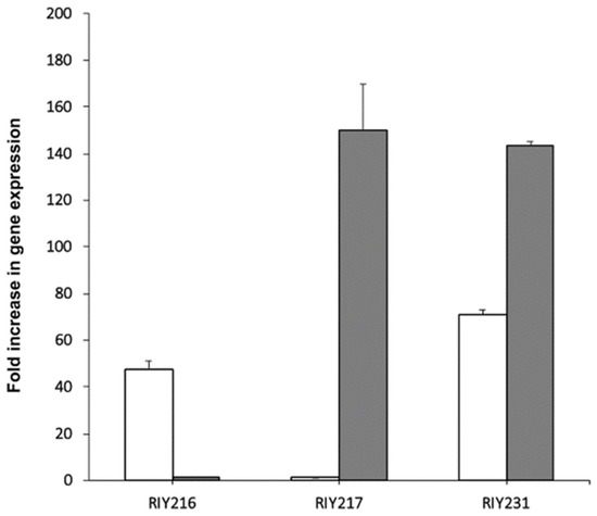 Transcriptional analysis of the genes ylGSH1 and ylGSH2 in strains RIY216 (pTEF-ylGSH1), RIY217 (pTEF-ylGSH2) and RIY231 (pTEF-ylGSH1-ylGSH2). Strains were grown in YPD for 24 h. Data are the mean and standard deviation of triplicate experiments. Values are expressed as the fold difference compared to the corresponding expression level in wild-type strain JMY2900. The gene ylGSH1 is shown in white and ylGSH2 in light grey.