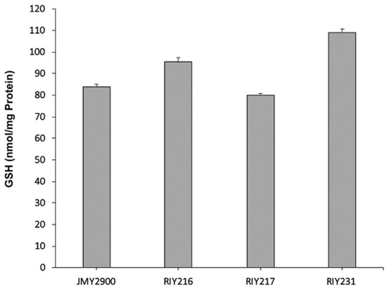 - Xu, W.; Jia, H.; Zhang, L.; Wang, H.; Tang, H.; Zhang, L. Effects of GSH1 and GSH2 gene mutation on glutathione synthetases activity of Saccharomyces cerevisiae. Protein J. 2017, 36, 270–277. [Google Scholar] [CrossRef]