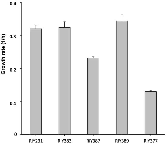 As a first characterization, the resulting strains were grown for 24 h in YNB medium containing 10 g/L of the different pure carbon sources, namely glycerol (YNBG), starch (YNBS), inulin (YNBI), lactose (YNBL) and glucose (YNBD). The growth rate of strains RIY383, RIY387, RIY389, RIY377 and RIY231, respectively, were then calculated. As shown in Figure 3, strains RIY383 (glycerol adapted) and RIY389 (inulin adapted) grew better (0.32 and 0.34 h−1, respectively) compared to strain RIY231 (pTEF-ylGSH1-ylGSH2) on glucose medium (0.32 h⁻1). By contrast, strains RIY387 (starch adapted) and RIY377 (lactose adapted) had a significantly lower growth rate (0.23 h−1 and 0.13 h⁻1, respectively). These cell growth values could be attributed to a weak ability of strain RIY387 and RIY377 to hydrolyze starch and lactose, respectively.
